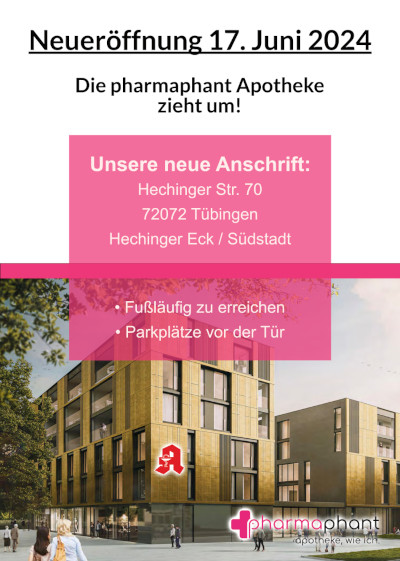 Ab Mitte Juni begrüßen wir Sie in unserer neuen pharmpahant Apotheke im Süden von Tübingen.